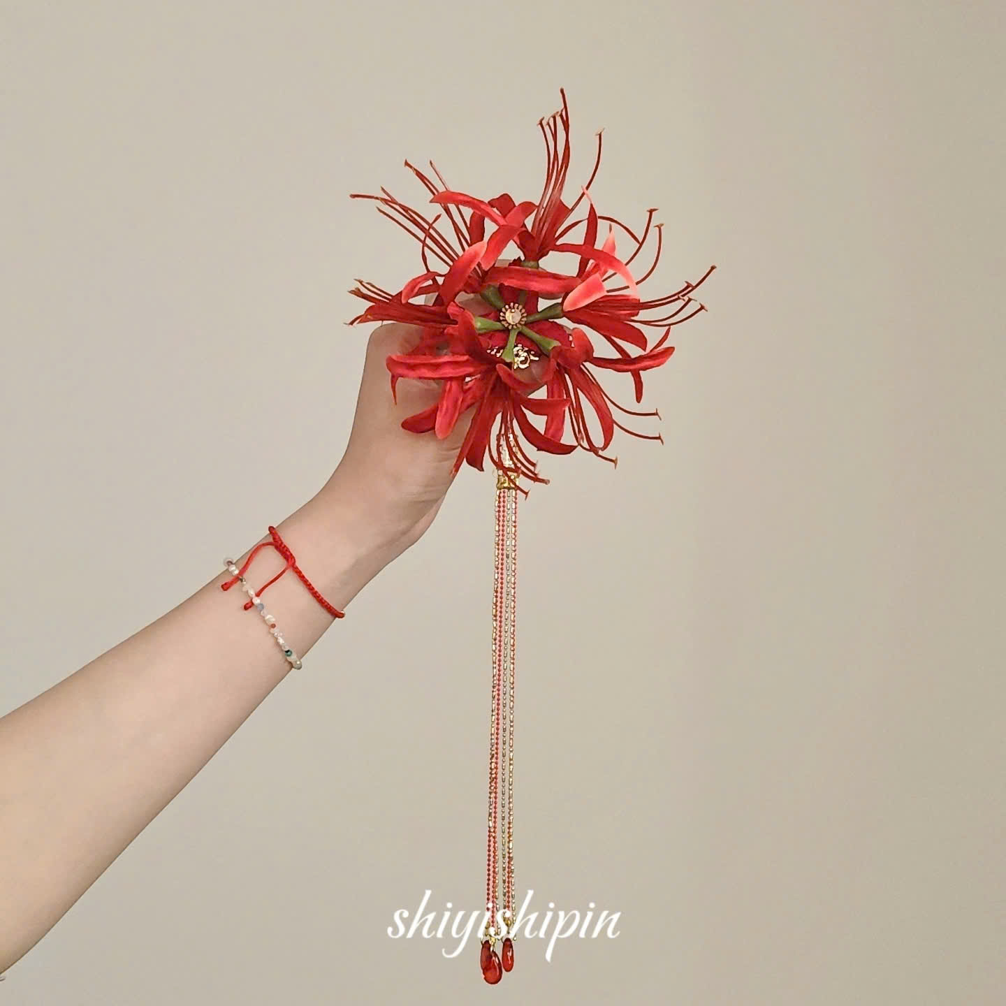 Kẹp Tóc Hoa Bỉ Ngạn Đỏ Kèm Dây Xích Đá Tua Rua – Nét Đẹp Huyền Bí Và Quyến Rũ