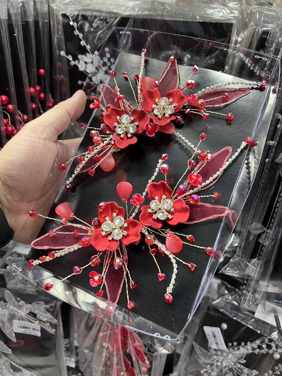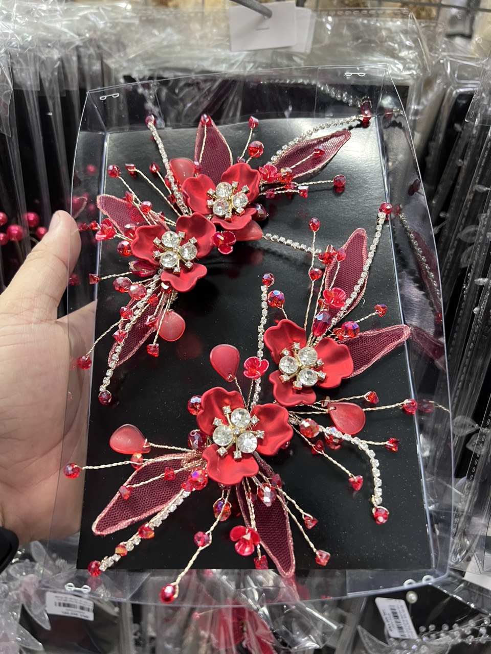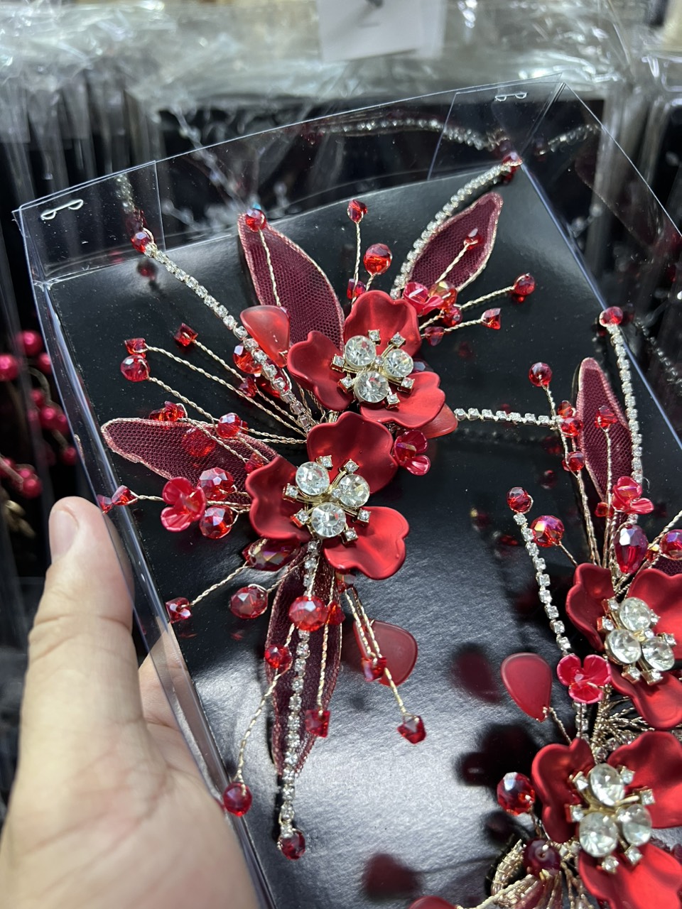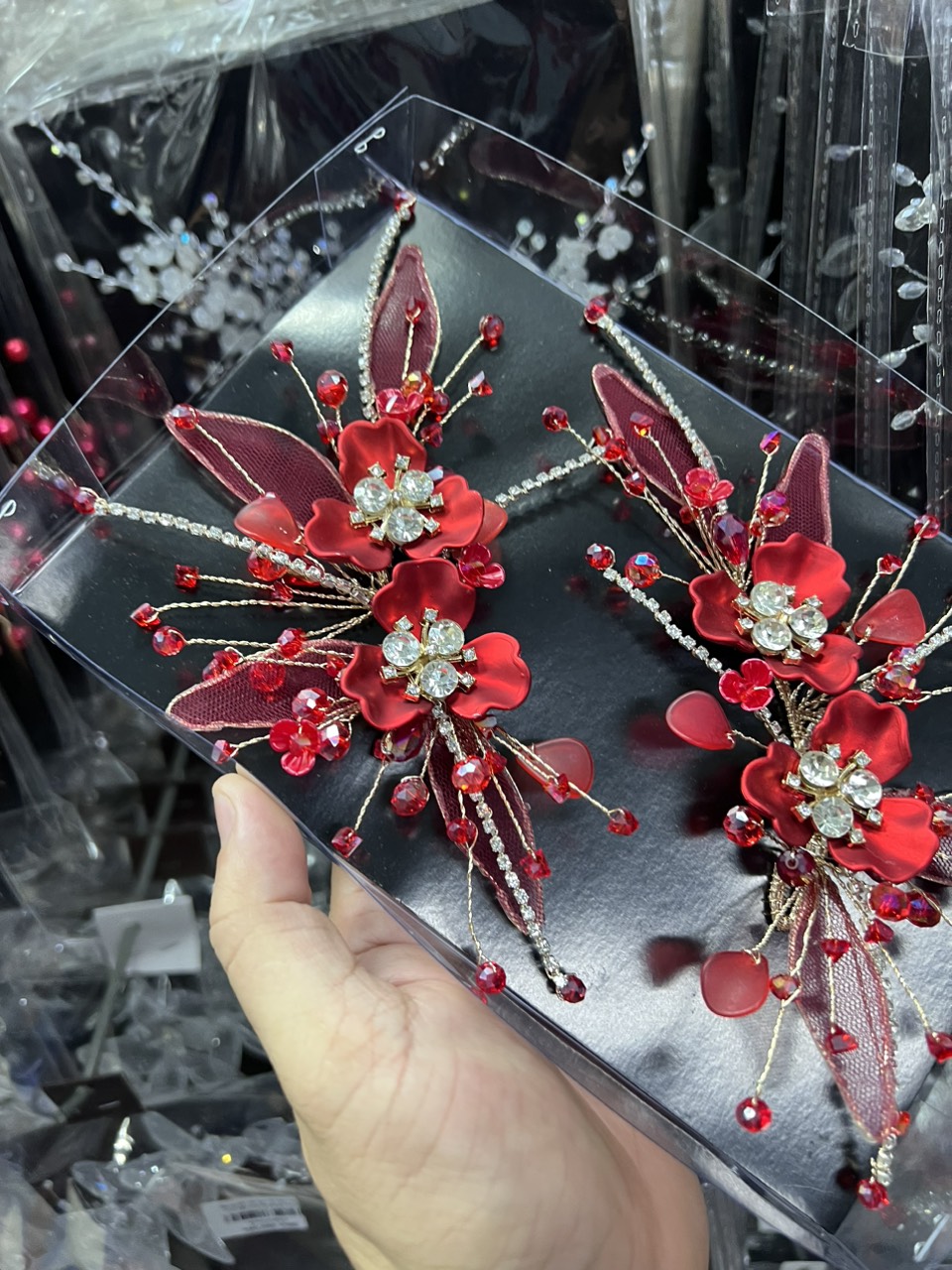 Kiệt tác đẹp như mơ: Đôi cài tóc cô dâu hoa đỏ lá dài đính đá - Mẫu mới T12/2023