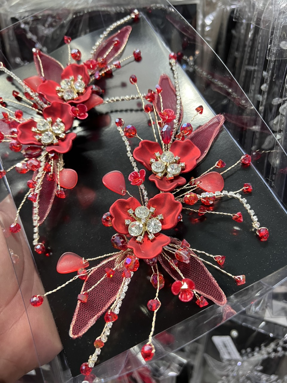 Đính Đá Lấp Lánh: Bằng cách kết hợp tinh tế giữa hoa đỏ, lá cây, và những viên đá lấp lánh, đôi cài tóc của chúng tôi không chỉ là phụ kiện trang trí, mà còn là điểm nhấn làm nổi bật vẻ đẹp tự nhiên của bạn.