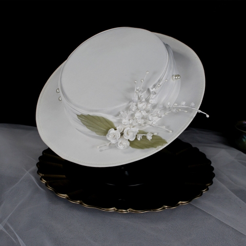 Mũ công nương trắng vành rộng đính hoa hồng trắng kết lưới Giangpkc 6/2022